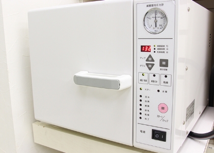 治療に使用する器具は洗浄後、高圧蒸気滅菌器にて徹底した滅菌処理を行っています。また、治療中は歯の削りカスや唾液、血液など細かい粉塵が飛び散ってしまいますので、口腔外バキュームを使用し瞬時に吸引することで清潔な空気環境を保つようにしています。治療ごとにユニットのアルコール消毒も必ず行っています。